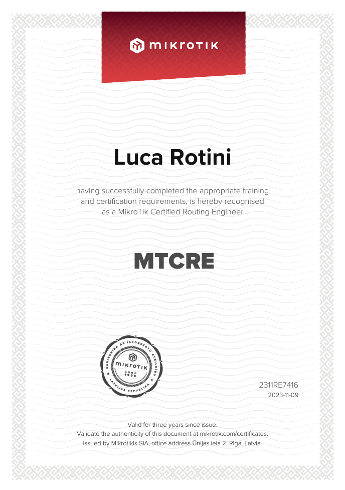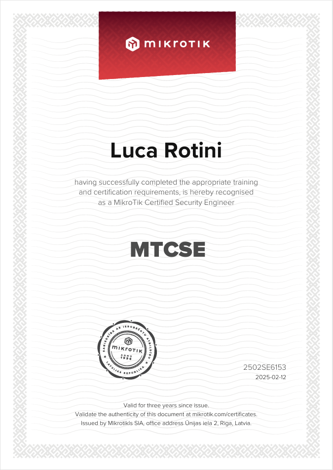 Lavoro con precisione e affidabilità, utilizzando strumentazione professionale e aggiornandomi costantemente. Sono certificato Mikrotik, garanzia di competenza nel mondo del networking
